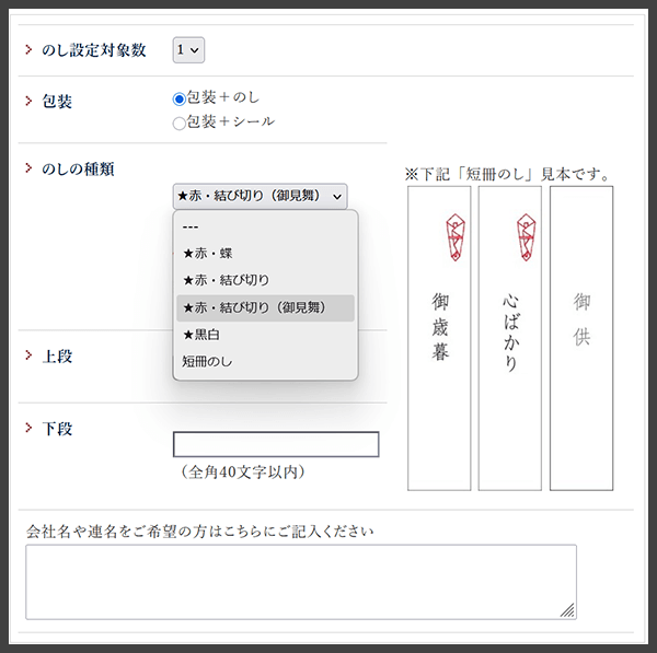 ※包装や熨斗不可の商品については、選択肢には出てきません。