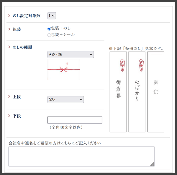 「包装+のし」をクリックすると、のしの種類・上段(表書き)・下段(名入れ)のご入力頂けます。